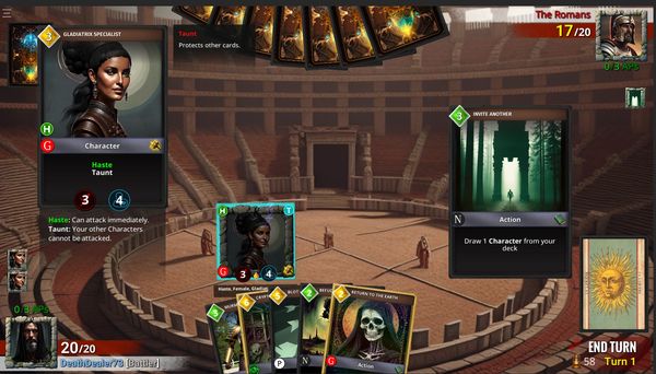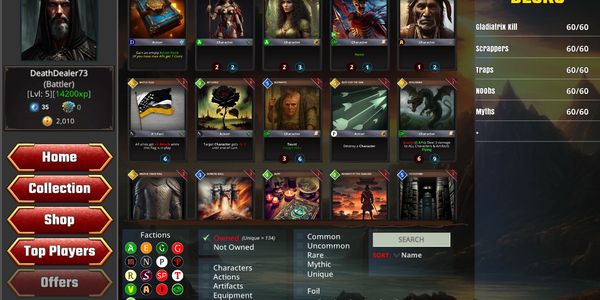 For the Glory of Gods is an online trading card game at heart. But it is also much more! Play the Gauntlet for challenging puzzles that you must solve to win coins, cards, and packs! Play multiplayer matches against live opponents to stay atop the leaderboard for monthly prizes and fame!
